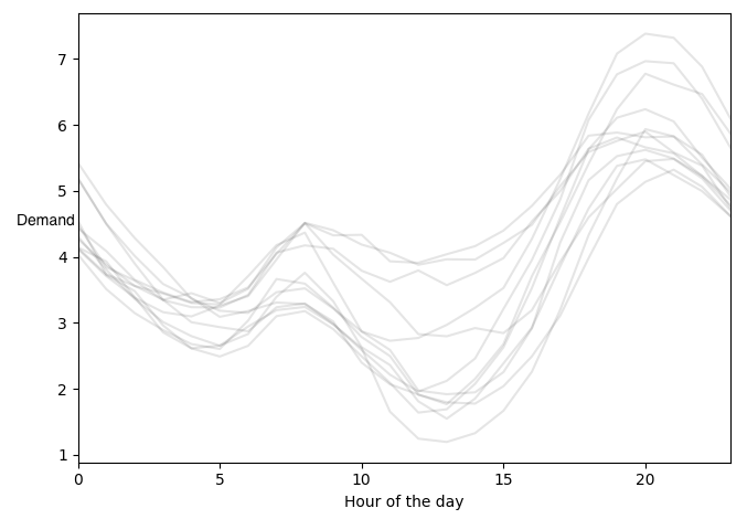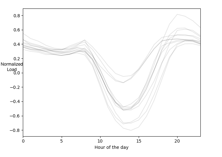 Once we selected the subset of customers, we proceeded with a K-means clustering analysis to identify customers with similar usage patterns. We took a two-step approach: first clustering customer load profiles for maximum load and then clustering for an average normalized load. Clustering for maximum load allowed us to visualize which customers had the largest differential between the peak and trough and highest peaks, as shown in the chart below.