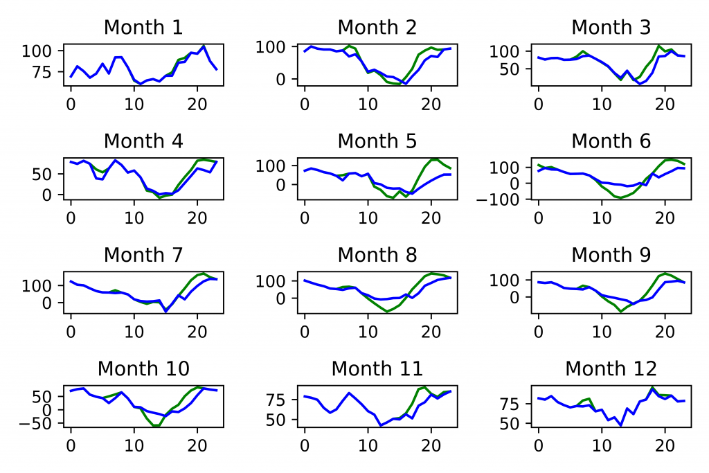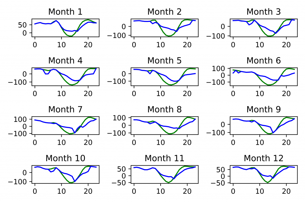 In the following “Monthly Load Shifting” and “Monthly Max Demand Reduction” graphs, the green lines represent the pre-storage monthly usage/max demand and the blue lines are the post-storage monthly usage/max demand. In both graphs, the x-axis is hours of the day. In the “Monthly Load Shifting” graph, the y-axis is load. In the “Monthly Max Demand Reduction” graph, the y-axis is max demand. Again, substantial impacts of the batteries are apparent from the reduced peaks and troughs, in both the load shifting and demand reduction evaluations.