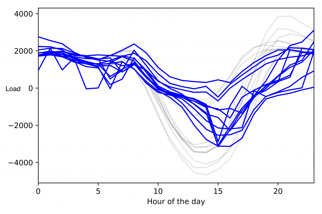 The above cluster represents 170 of the initial 1347 customers on E-6. These customers were further clustered based on average normalized load. The average normalized load clustering allowed us to visualize which customers with these higher demands have the most solar exports. Three of the six new clusters had a significant amount of solar exports as can be seen in the following cluster graph. All three clusters had profiles similar to this one.