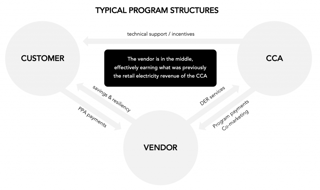 Under typical customer program structures, the vendor is in the middle, effectively earning what was previously the retail electricity revenue of the CCA.