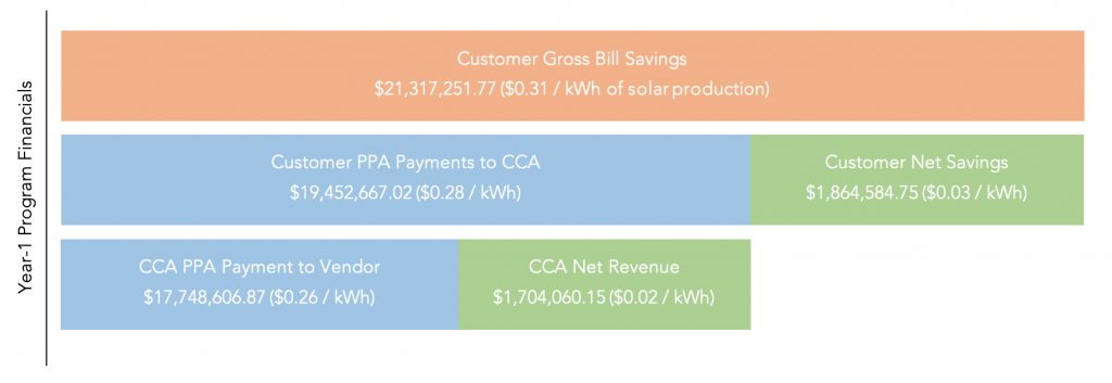 The following financials from the case study show that customers & CCAs both earn benefits under this Distributed PPA Program. The CCA charges the customer a PPA rate that is lower than the customer’s gross bill savings, but at a rate higher than what the CCA is paying to the vendor, thus generating both customer net savings, and CCA net revenue.