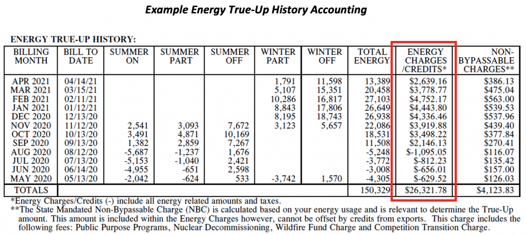The customer may grow accustomed to those $35 bills (only service charges) and be surprised when they suddenly get their true-up bill for over $19,000! But as we saw previously, the large true-up bill is made up of energy charges from the previous 12 months. In this case it also includes credits from the first four months when their solar PV system generated more electricity than they used.